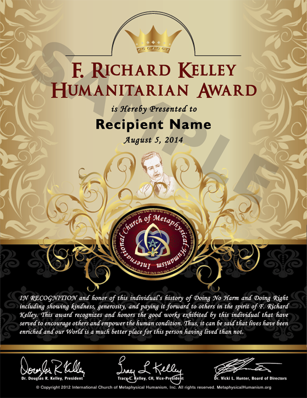 Objective: To recognize a person for having a history of kind and meaningful acts toward others. This award is usually conferred on someone after several years of kind acts. It is more difficult to qualify for this award. This award was initiated in January 2013. AWARD WORDING: "IN RECOGNITION and honor of this individual’s history of Doing No Harm and Doing Right including showing kindness, generosity, and paying it forward to others in the spirit of F. Richard Kelley. This award recognizes and honors the good works exhibited by this individual that have served to encourage others and empower the human condition. Thus, it can be said that lives have been enriched and our World is a much better place for this person having lived than not." AWARD RECIPIENTS: Dr. Charles Broadway, PhD, USA, January 2013 Dr. Karthikeyan Venkatesan, PhD, India, August 2014 Tony Saint Tone, USA, August 2017 Janie Boisclair, USA, August 2017 Dr. Claudio Toledo, USA, July 2018 Dr. Kazie Ann Morie Kasimbie, Jamaica, February 2021 |