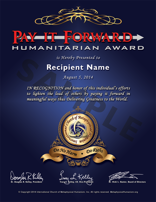 The concepts of Doing Right and Pay it Forward are among the foundational principles and Sacred Obligations of the International Church of Metaphysical Humanism (ICMH). It is only fitting, therefore, that ICMH offers humanitarian awards to recognize those individuals who Deliver Greatness in meaningful ways for the benefit of others. The criteria for the two humanitarian awards ICMH confers vary slightly (see below). ICMH looks for opportunities to confer these awards. In time, the lists below will undoubtedly grow. If you know someone who should be considered for one of these awards, please contact admin@icmhchurch.org. Be sure to give a detailed explanation as to why the person is qualified for one of these awards.