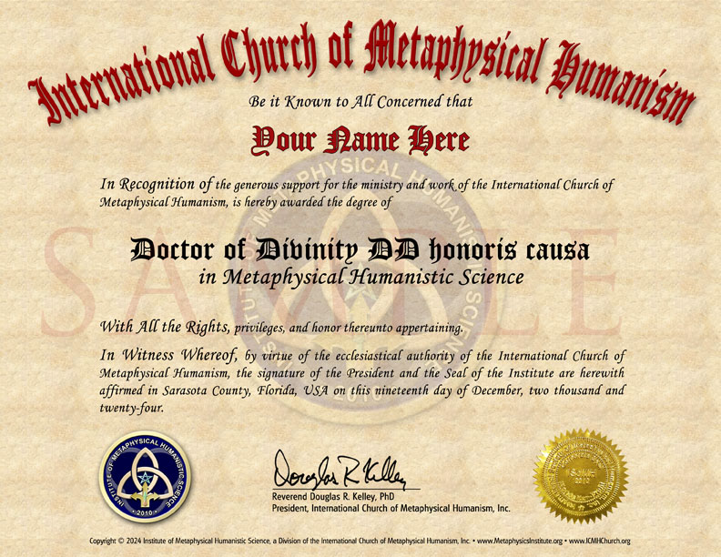You may send donations to the International Church of Metaphysical Humanism, 4368 Padgette Street, North Port, FL 34291 USA. Please make your checks/money orders payable to "International Church of Metaphysical Humanism" or "ICMH". All donations will be acknowledged via email and those above $250 will receive a letter of acknowledgment for tax purposes.